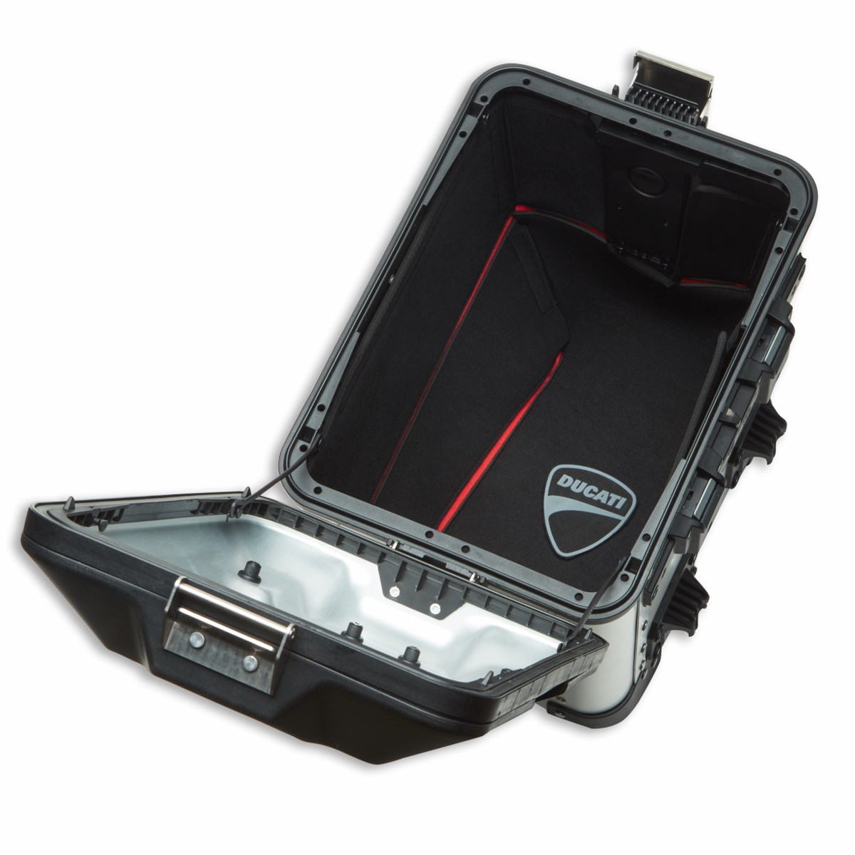 Das Innenfutter für Aluminium-Seitenkoffer (96781831AA) ist speziell für die Auskleidung von Aluminiumkoffern konzipiert. Es besteht aus dem stoßdämpfenden Material Eva, das mit schwarzem Lycra beschichtet ist und dadurch Stöße absorbiert, um den Inhalt der Koffer effektiv zu schützen. Das Innenfutter ist mit einem Ducati-Logo sowie roten Polyesterbändern an den Nähten versehen, die dem Produkt einen charakteristischen Stil verleihen.