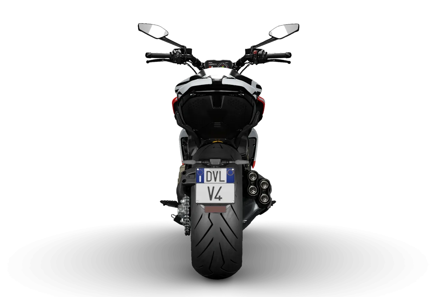 Optisch ist die RS keine Variation, sondern ein eigener Auftritt. Das RS-Lackkleid setzt das Logo bewusst in Szene, während zahlreiche neu gestaltete Elemente die Silhouette schärfen: Lufteinlässe, Einzelsitz-Heck, Kotflügel und Tankabdeckungen - konsequent aus Carbon gefertigt. Die Linien wirken gespannter, technischer, kompromissloser. Dazu kommt die unverwechselbare Lichtsignatur: vorn die doppelte C-Form des LED-Tagfahrlichts, hinten eine moderne Punkt-LED-Matrix unter dem Heck - präzise, aggressiv, sofort erkennbar. Der ikonische Vierfach-Auspuff bleibt das markanteste Stilmerkmal der Diavel-Familie, hier mit Titan-Endkappen und Aluminiumabdeckungen - eine skulpturale Visitenkarte, die die RS-Identität bis ins Detail trägt.