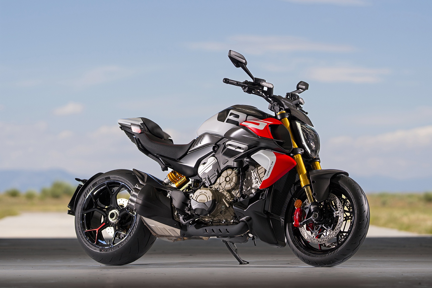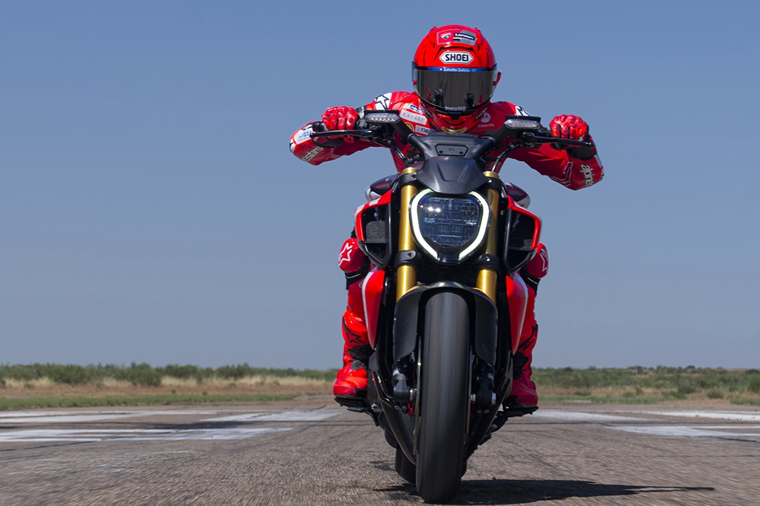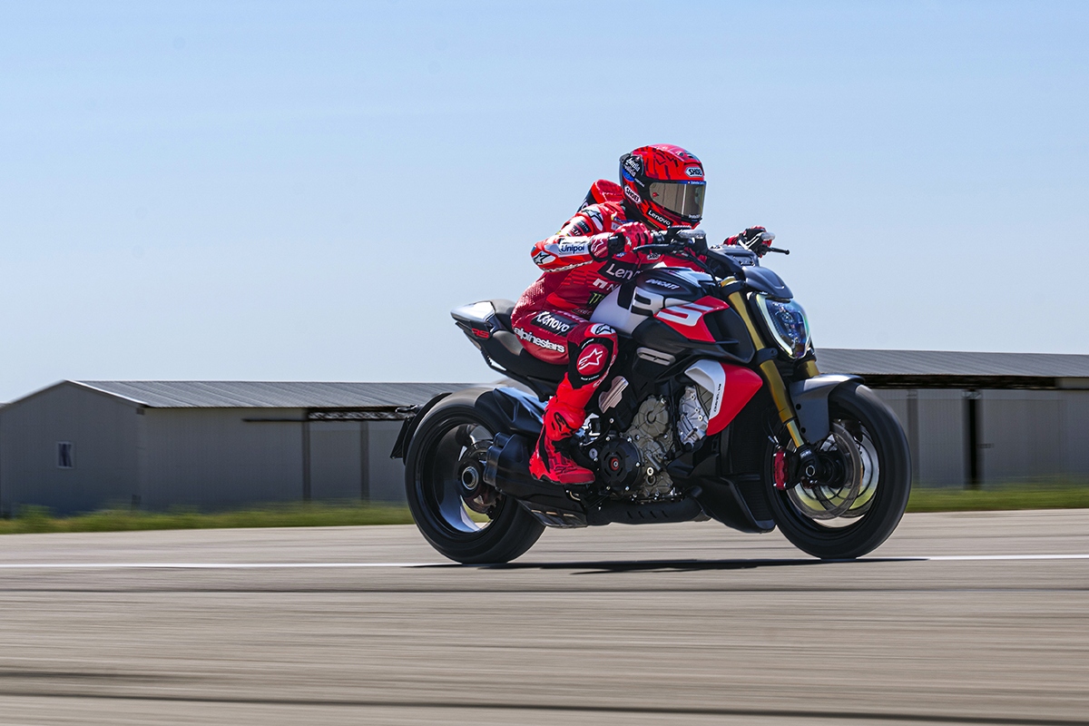 Die Bremsanlage ist direkt aus dem Panigale-Umfeld abgeleitet: 330-mm-Scheiben vorn mit Brembo Stylema Monoblocs, hinten 265 mm mit Brembo-Schwimmsattel - ergänzt durch Cornering ABS. Ducati nennt eine Spitzverzögerung von 11,5 m/s², eine Größenordnung, die üblicherweise dem Rennsport vorbehalten ist. In der Praxis heißt das: spätere Bremspunkte, mehr Stabilität, klarere Dosierbarkeit - ein Setup, das zur Beschleunigungsleistung passt.