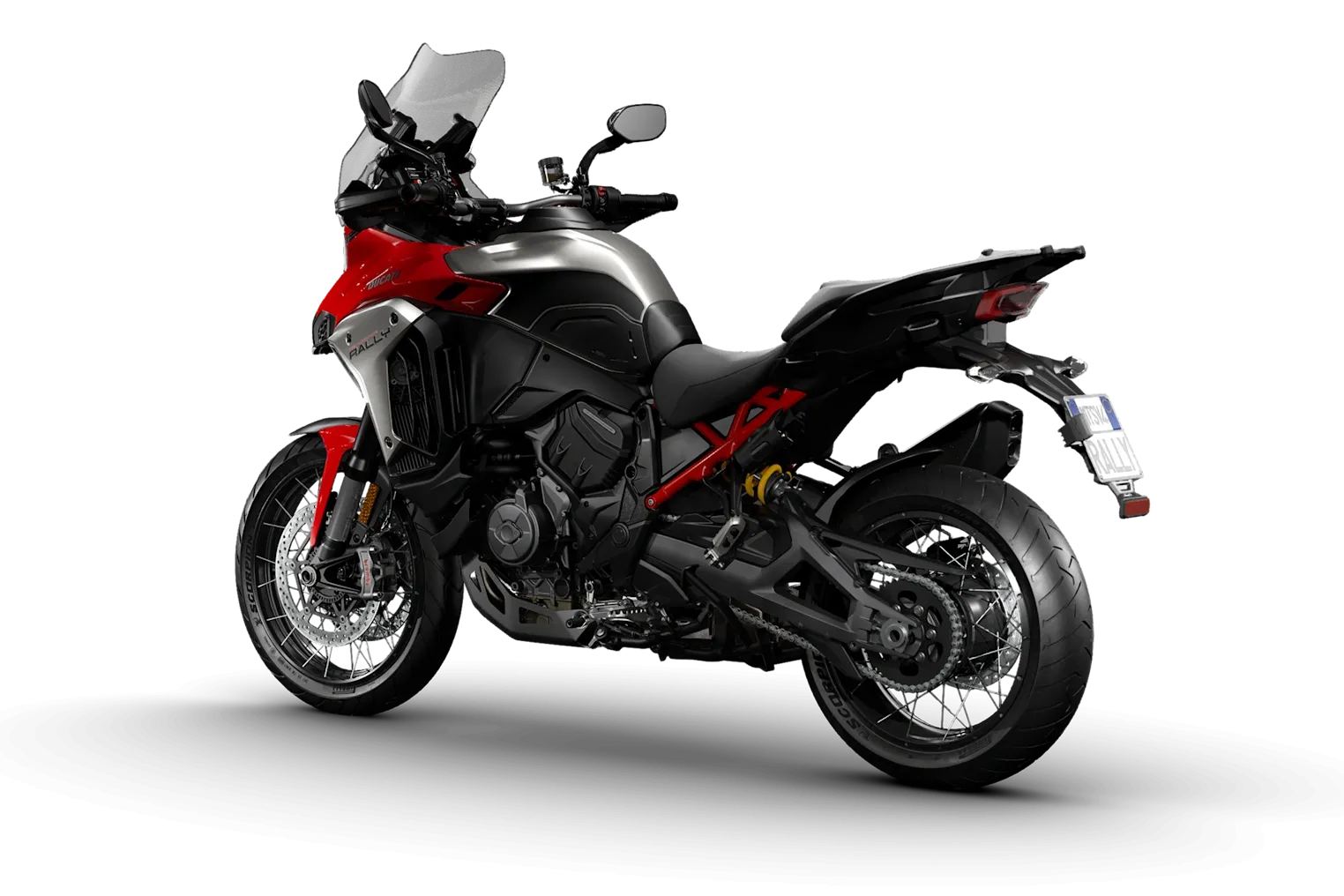 Die Rally ist für weite Horizonte gebaut - und deshalb auf ein Fahrwerk angewiesen, das Bedingungen in Echtzeit verarbeitet. Die Marzocchi semi-aktive Federung wird über Ducati Skyhook Suspension (DSS) Evolution geregelt und bietet mehr Federweg als Multistrada V4/V4 S: 200 mm vorn und 200 mm hinten. DSS ermöglicht die Anpassung von Federvorspannung sowie Druck- und Zugstufe und erlaubt es, die hydraulische Dämpfung sogar während der Fahrt zu verändern.