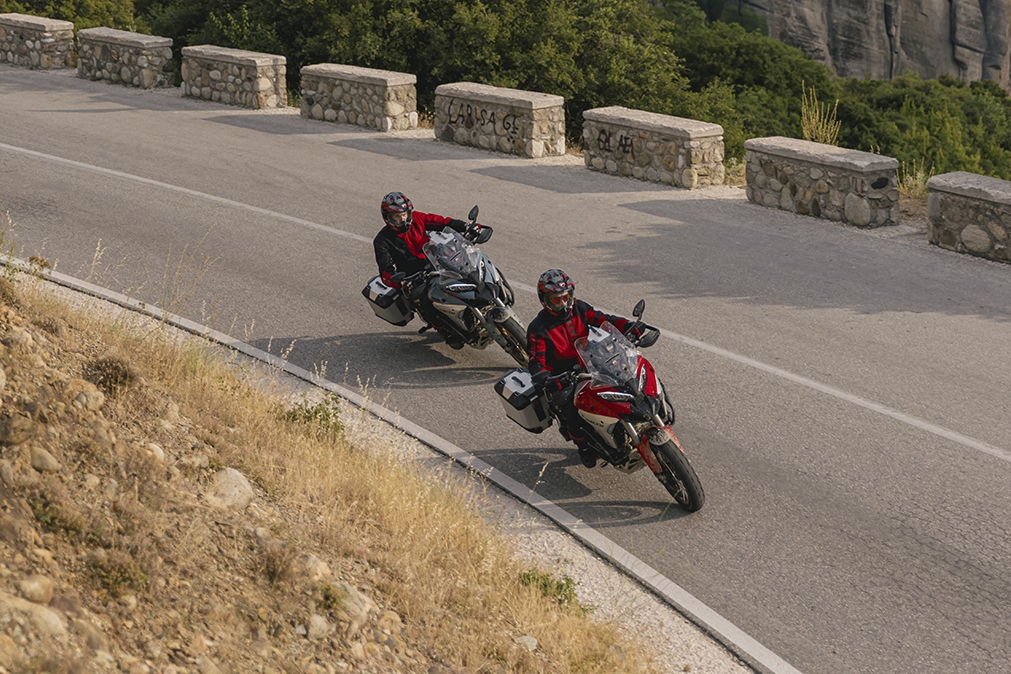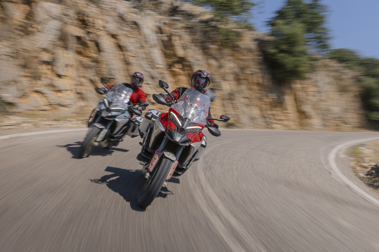 Der V4 Granturismo bleibt das ideale Reise-Herz, weil er Kraft nicht als Nervosität liefert, sondern als kontrollierbaren Schub. 170 hp bei 10.750/min und 123,8 Nm bei 9.000/min stehen für Performance - doch entscheidend ist die lineare, progressive Charakteristik, die Ducati bewusst auf Langstrecke und Vielseitigkeit abstimmt. Die MotoGP-abgeleitete gegenläufige Kurbelwelle reduziert den gyroskopischen Effekt der Räder und unterstützt damit Handling und Präzision, besonders bei einem voll beladenen Reisebike.