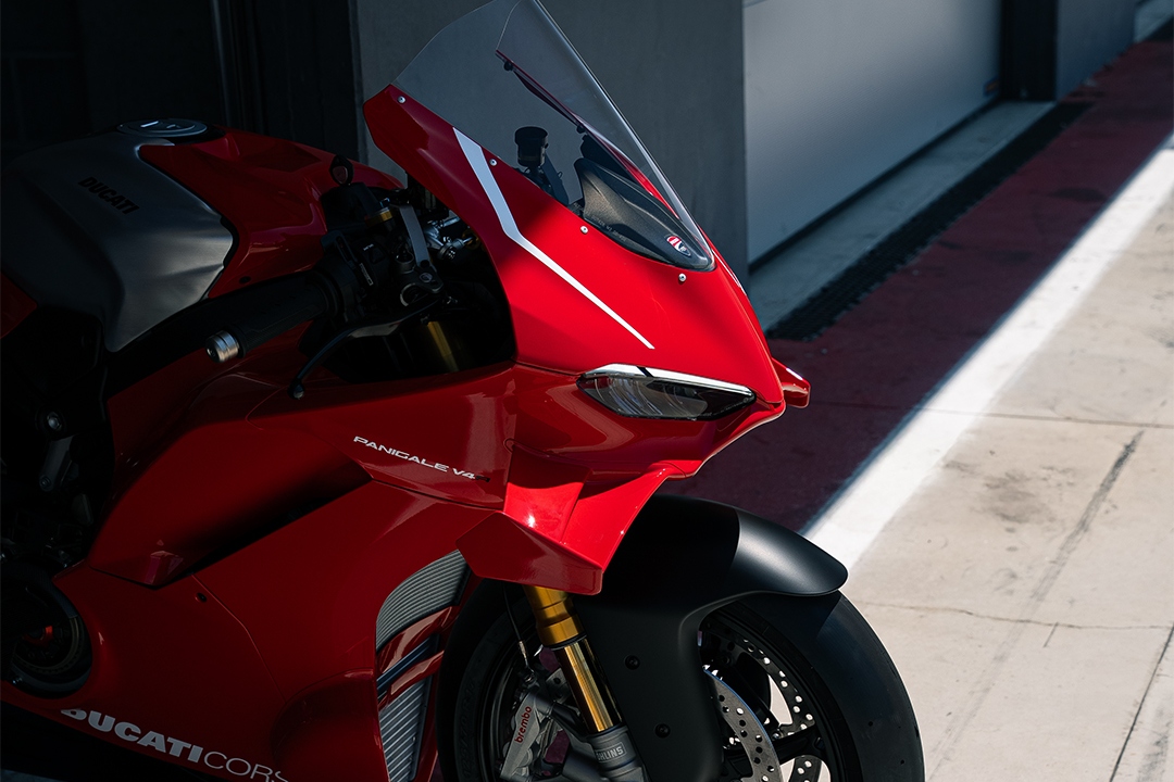 Im Text wird die V4 R als erstes straßenzugelassenes Motorrad mit Corner Sidepods beschrieben - ein klarer Hinweis auf eine Aerodynamik- und Stabilitätslogik, die aus dem Rennsport stammt. (In deinem technischen Datenblock ist das als Feature beschrieben, ohne separate Maßangaben.)