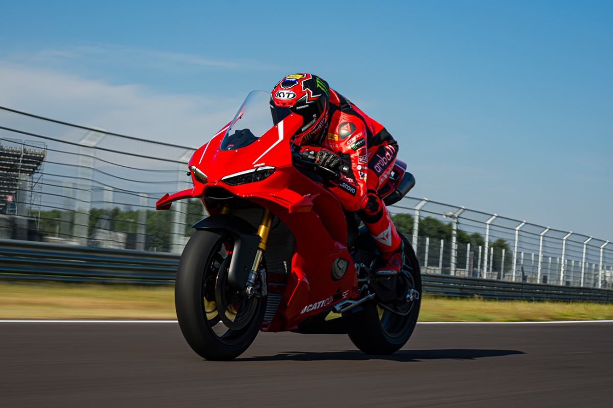 Die V4 R nutzt den 998 cm³ Desmosedici Stradale R, abgestimmt auf WorldSBK-Reglement: 218 hp bei 15.750/min und 114,5 Nm bei 12.000/min. Die Drehzahlbereiche und die Charakteristik sind klar „Rennmotor mit Straßenzulassung“.
