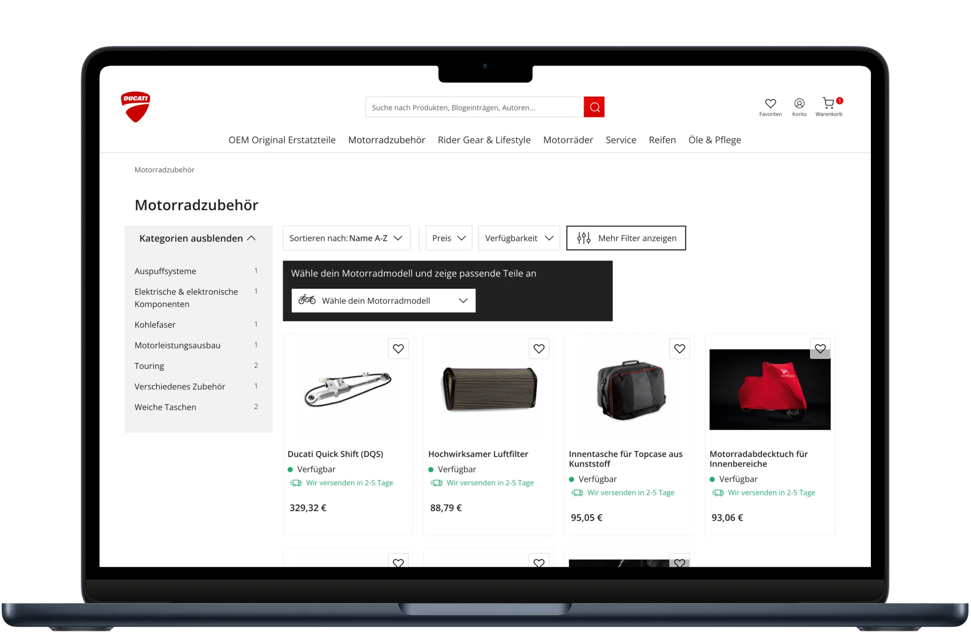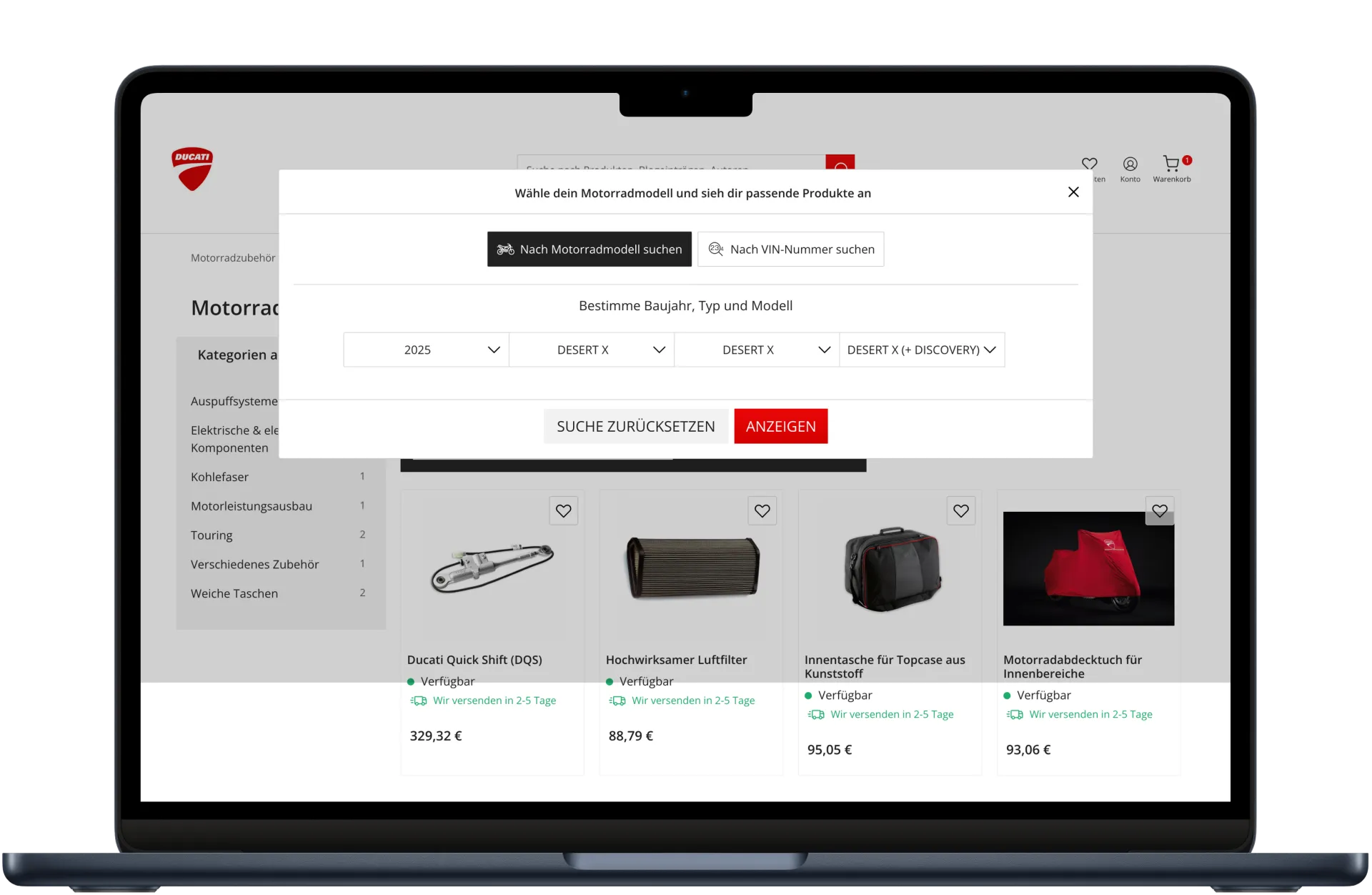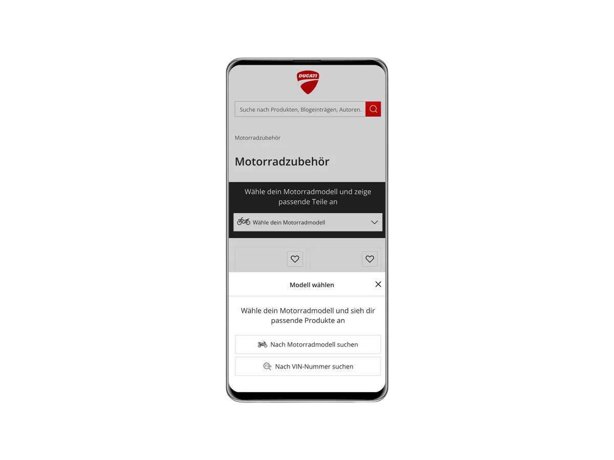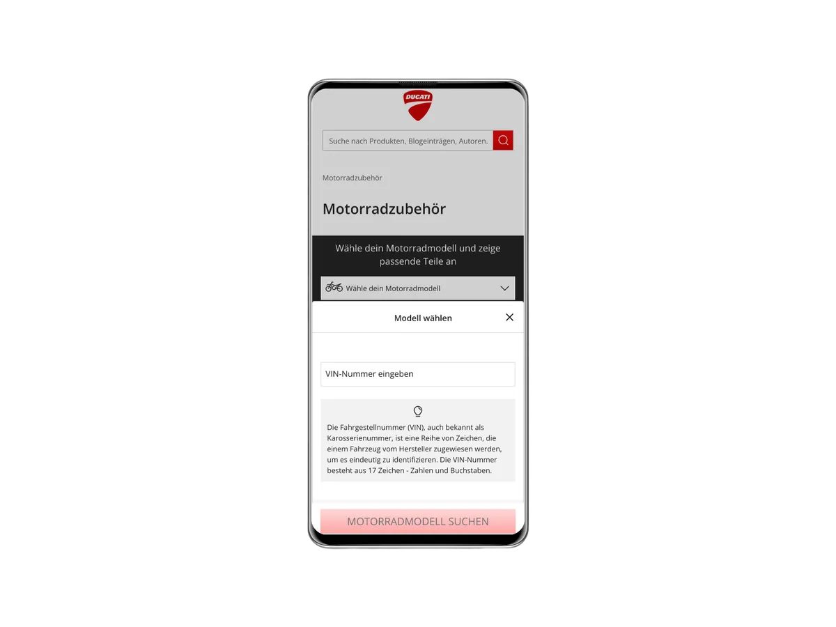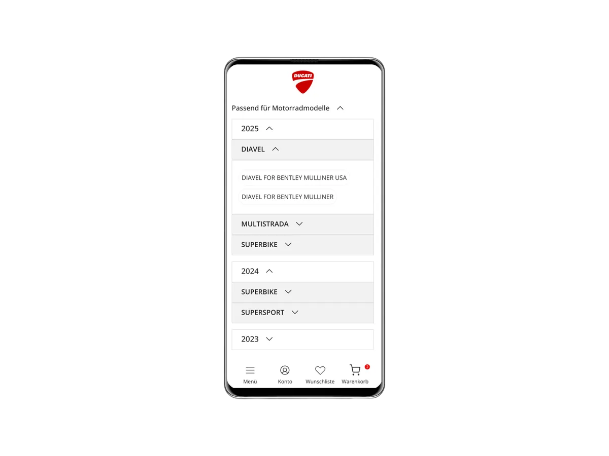 Suchen Sie hingegen Produkte außerhalb der Ducati OEM-Teilesuche – zum Beispiel Zubehör für Ihr Motorrad – steht Ihnen ein besonders intuitiver Modellfilter zur Verfügung. Damit können Sie schnell und einfach überprüfen, ob ein Produkt zu Ihrem Ducati passt. Der Filter ist an zwei Stellen im Shop verfügbar: