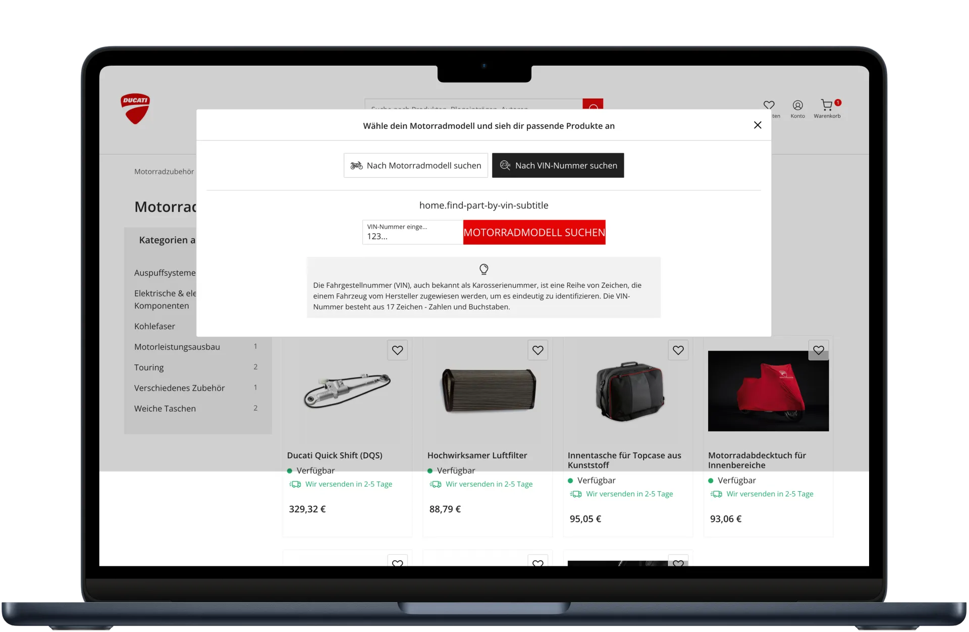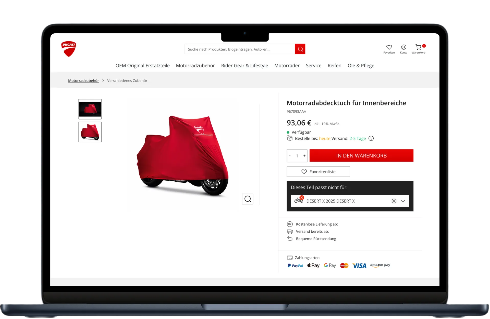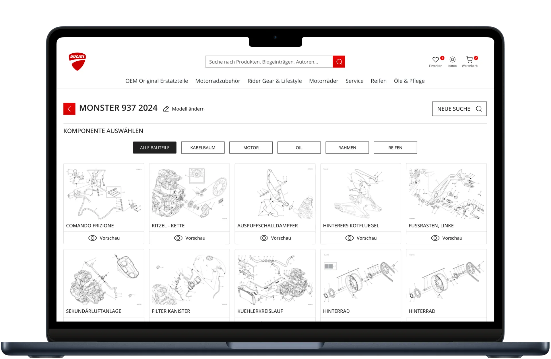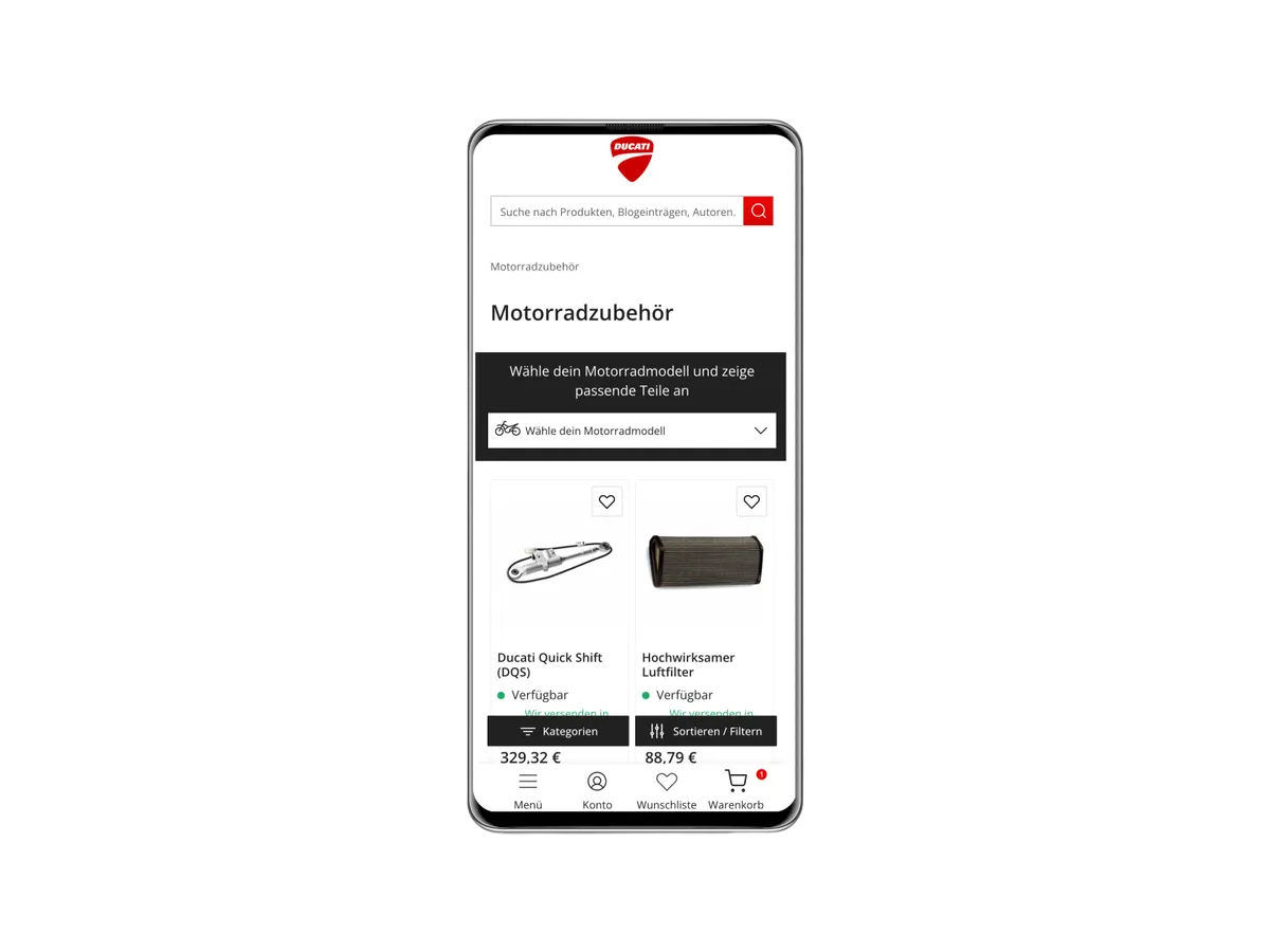 Suchen Sie hingegen Produkte außerhalb der Ducati OEM-Teilesuche – zum Beispiel Zubehör für Ihr Motorrad – steht Ihnen ein besonders intuitiver Modellfilter zur Verfügung. Damit können Sie schnell und einfach überprüfen, ob ein Produkt zu Ihrem Ducati passt. Der Filter ist an zwei Stellen im Shop verfügbar: