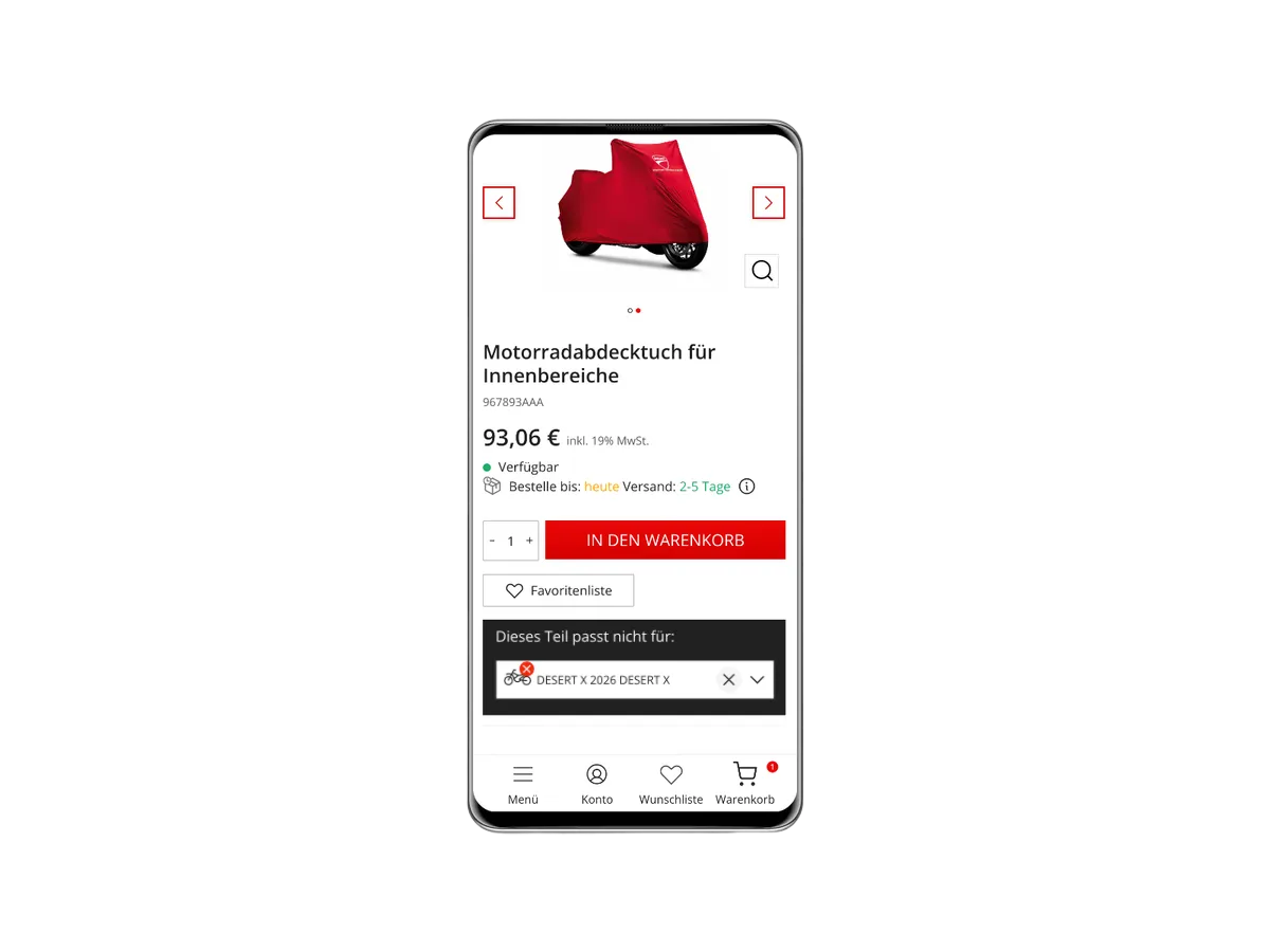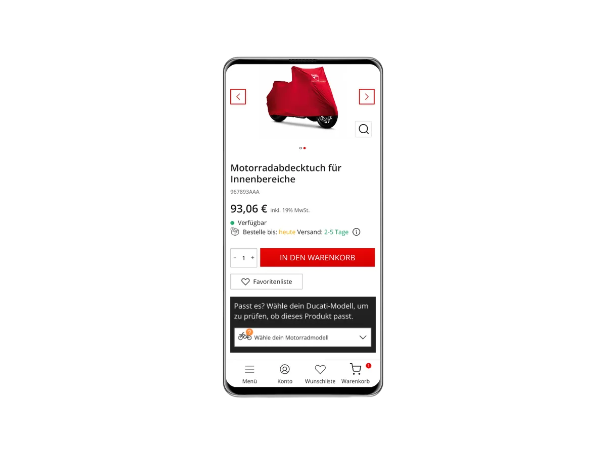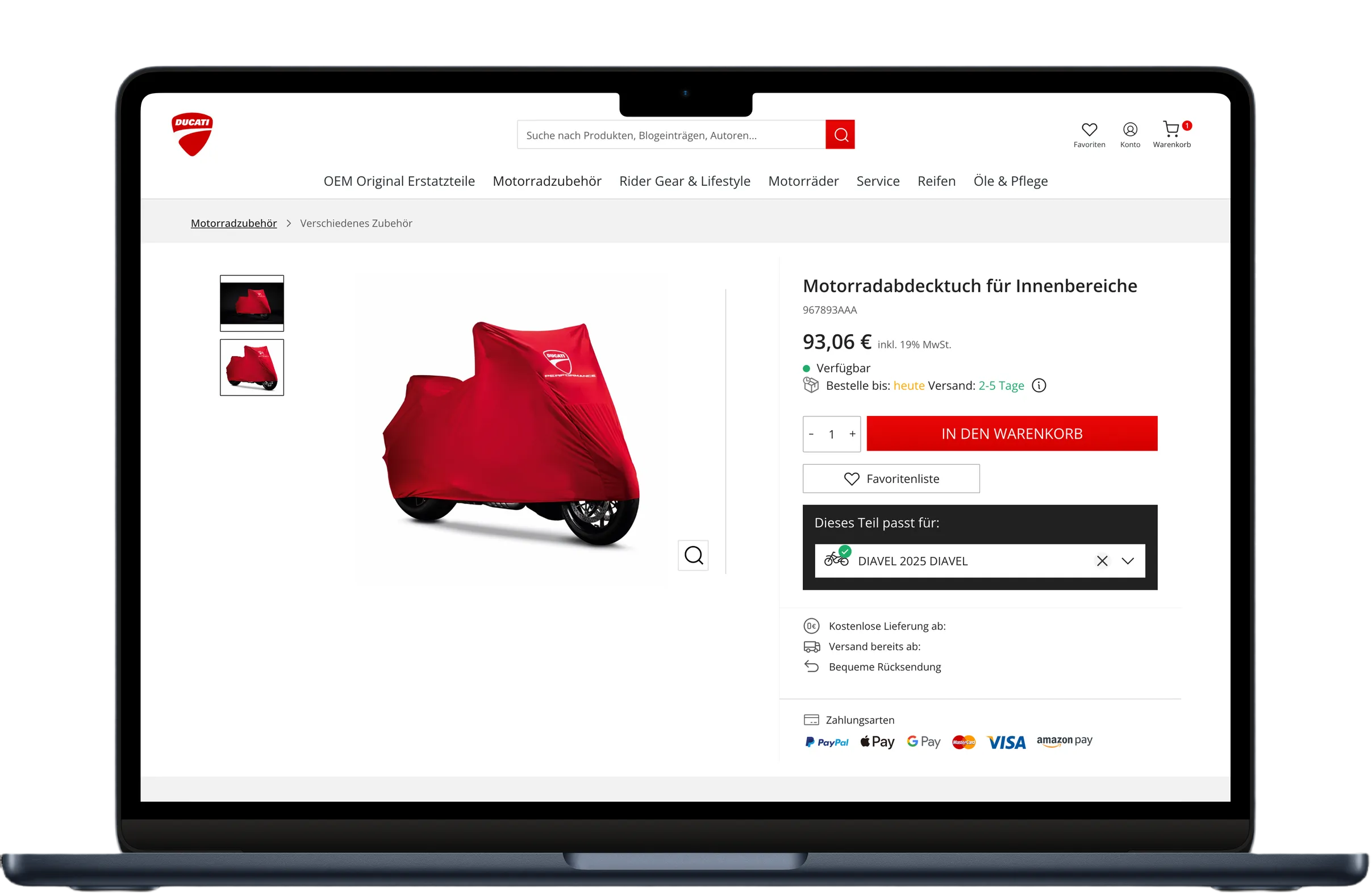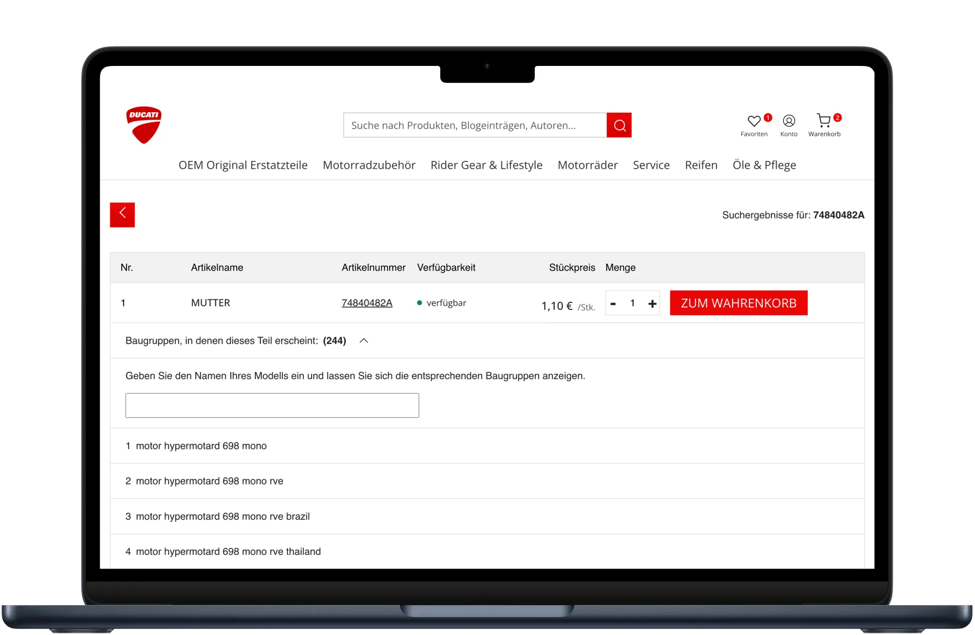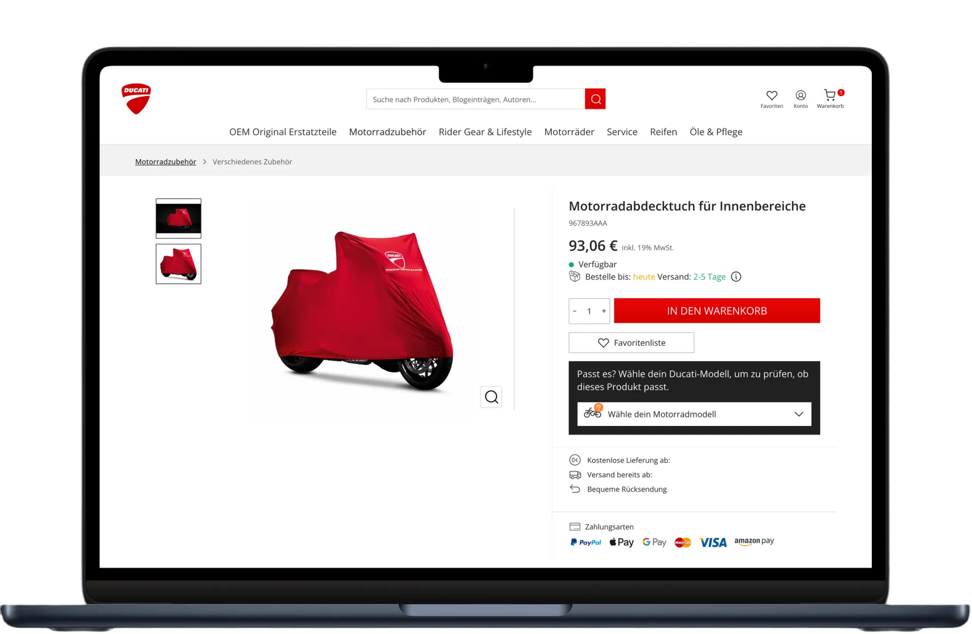 Suchen Sie hingegen Produkte außerhalb der Ducati OEM-Teilesuche – zum Beispiel Zubehör für Ihr Motorrad – steht Ihnen ein besonders intuitiver Modellfilter zur Verfügung. Damit können Sie schnell und einfach überprüfen, ob ein Produkt zu Ihrem Ducati passt. Der Filter ist an zwei Stellen im Shop verfügbar: