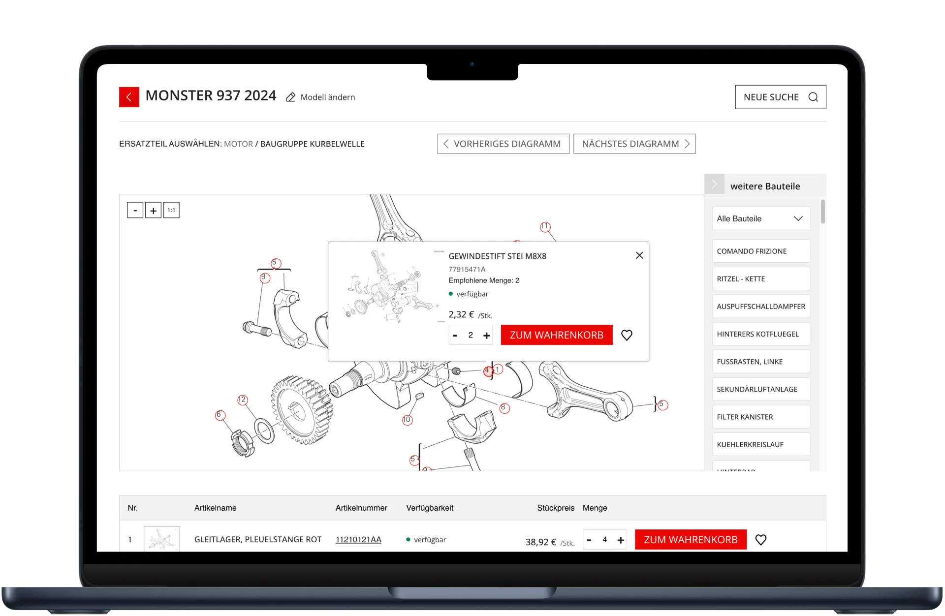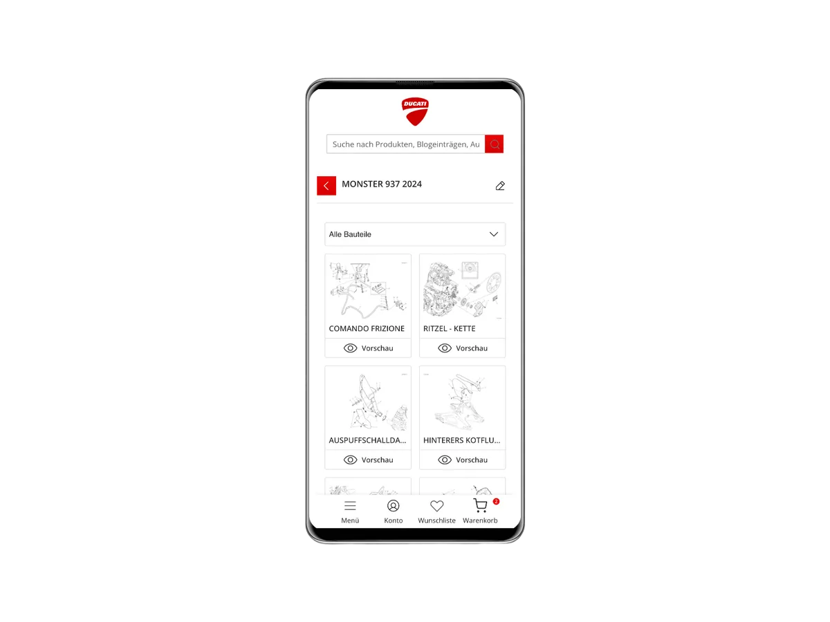 Nach der vollständigen Auswahl Ihres Motorrads wird Ihnen eine Übersicht mit technischen Explosionszeichnungen sowie allen verfügbaren, passenden Ducati Originalteilen für das gewählte Fahrzeug angezeigt.