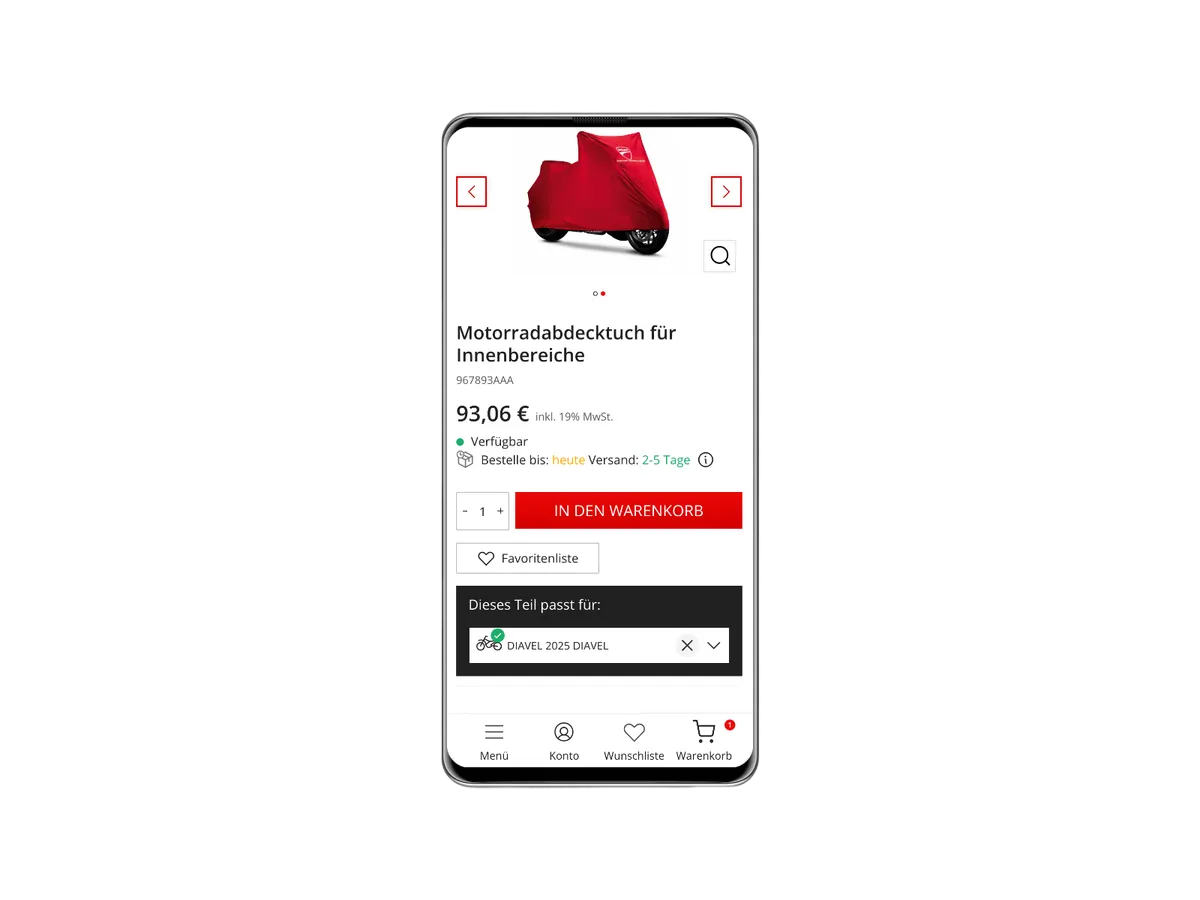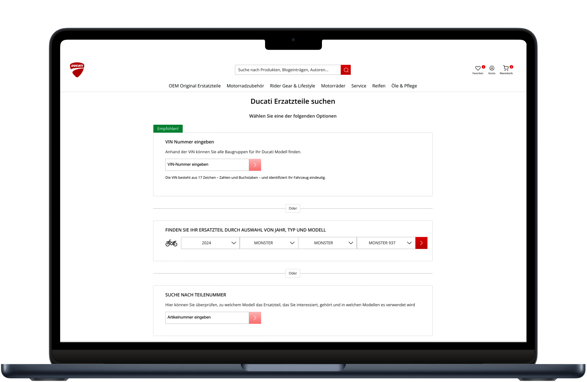 Nach der Auswahl Ihres Ducati Motorrads werden Ihnen ausschließlich passende Teile angezeigt. Kompatible Produkte sind zusätzlich mit einem grünen Hinweis gekennzeichnet, sodass Sie schnell erkennen, welche Teile zu Ihrem Modell passen und sicher die richtige Wahl treffen.