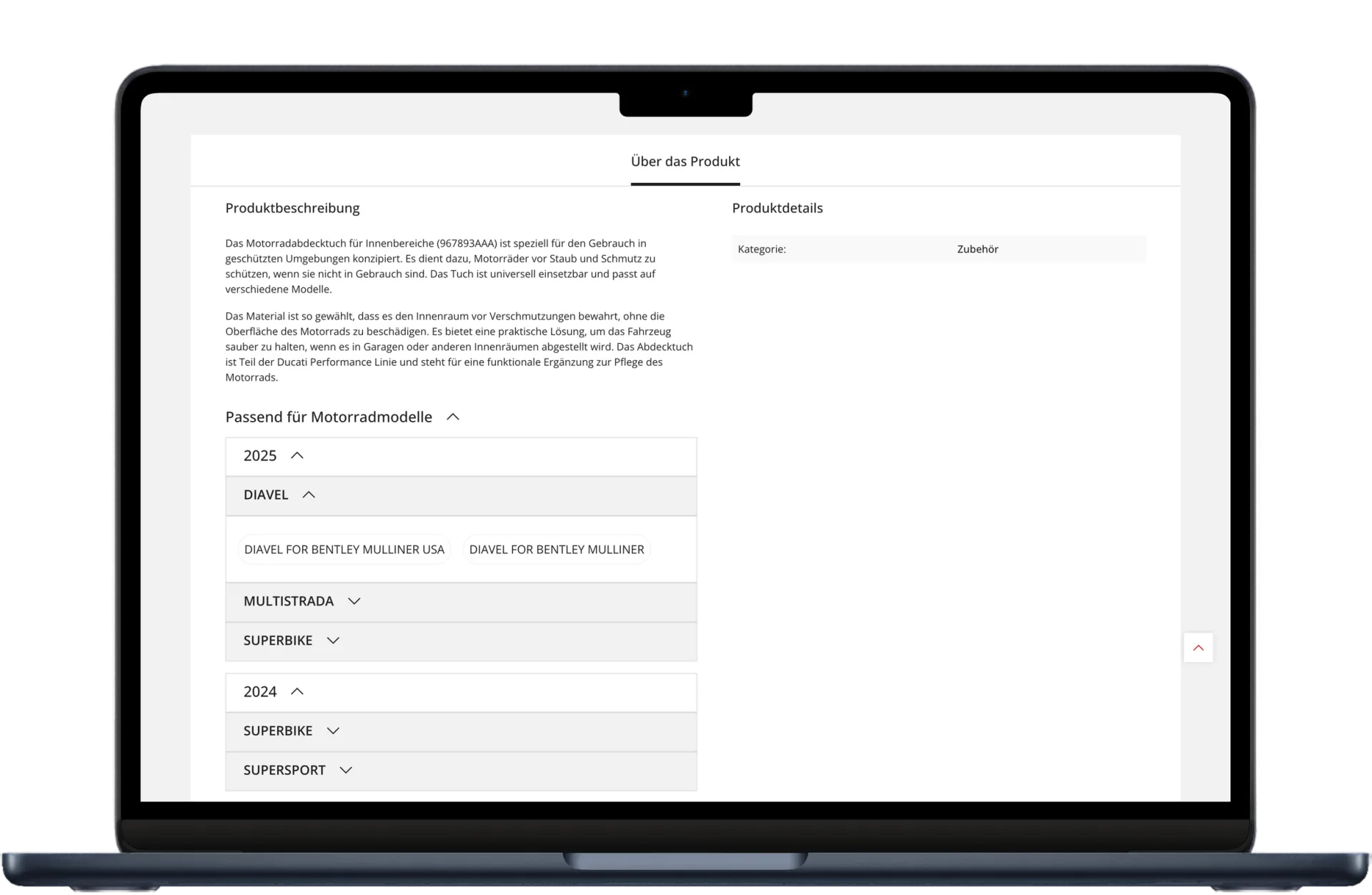 Zusätzlich findest du auf jeder Produktseite – egal ob Ersatzteil oder Zubehör – eine Übersicht aller Ducati Modelle, mit denen das Produkt kompatibel ist.