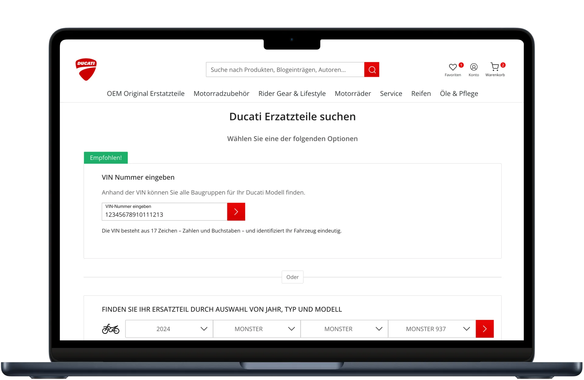 Bitte gib dabei möglichst viele Informationen zu deinem Ducati Motorrad an – Baujahr, Modell und VIN-Nummer – und teile uns mit, welche Teile oder welches Zubehör du suchst. In der Regel melden wir uns noch am selben oder spätestens am nächsten Werktag bei dir zurück.